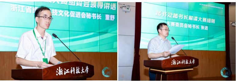 董舒代表主办单位讲话,他指出低碳循环作为新时代绿色发展的核心理念,正逐步成为推动全球经济转型升级的重要力量,希望越来越多大学生探索低碳循环的新思路、新方法,让我们的地球变得更加绿色、更加低碳、更加健康。张进通报了本届大赛相关事宜,对大赛组委会从大赛组织、宣传发动等工作进行了简要说明,并对实验研究、调研报告、产品设计与成果应用、产业赛道四个作品类别评分标准作了解读。