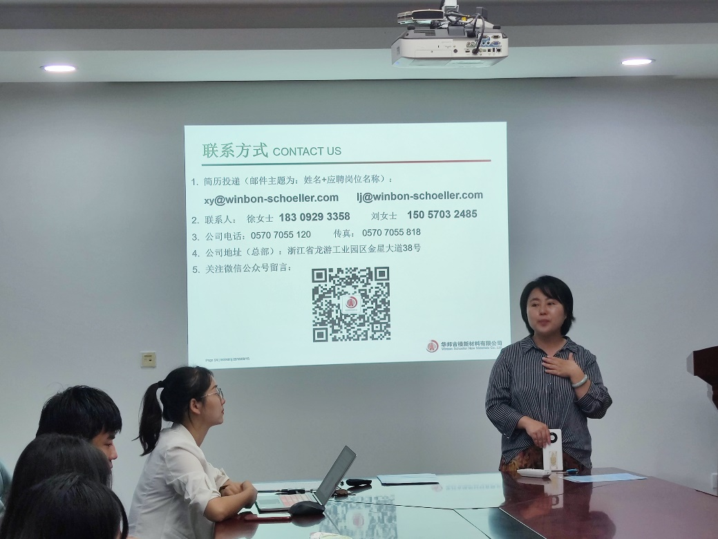 华邦古楼新材料有限公司人事部门总监田雪松女士与人事经理徐媛女士就51tv-51tv官方最新地址发布页、公司特色、工作环境、生活条件、薪资福利、发展途径等方面进行了系统介绍,陈建斌总工对同学们感兴趣的问题作了详细讲解。随后,同学们就普遍关注的实习就业岗位发展前景、薪资待遇等问题积极提问,展开交流。会后,部分同学投递了简历,寻求就业机会。