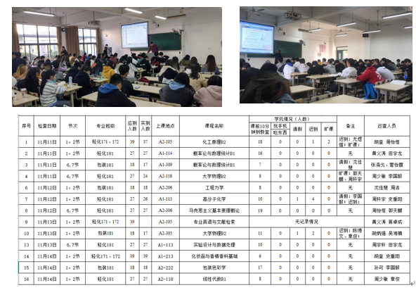 轻化171,172,化工原理B2,刘宝鉴老师,应到39人,7:50分到教室18人,8.00到教室38人,迟到1人。学生听课较认真。