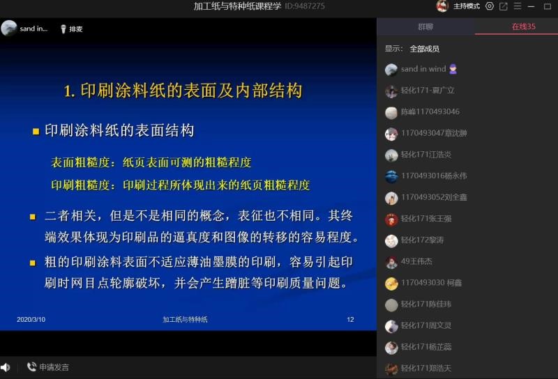2、加工纸与特种纸 1-16(1,2节)*A2-113 陈华/胡志军/李静 轻化工程171,172。应到39人,实到36人,杨芷蕊、王安南、吴锦涵未到。教师备课充分,教师熟悉线上授课软件,授课内容设置选择题等互动内容,课堂秩序良好。