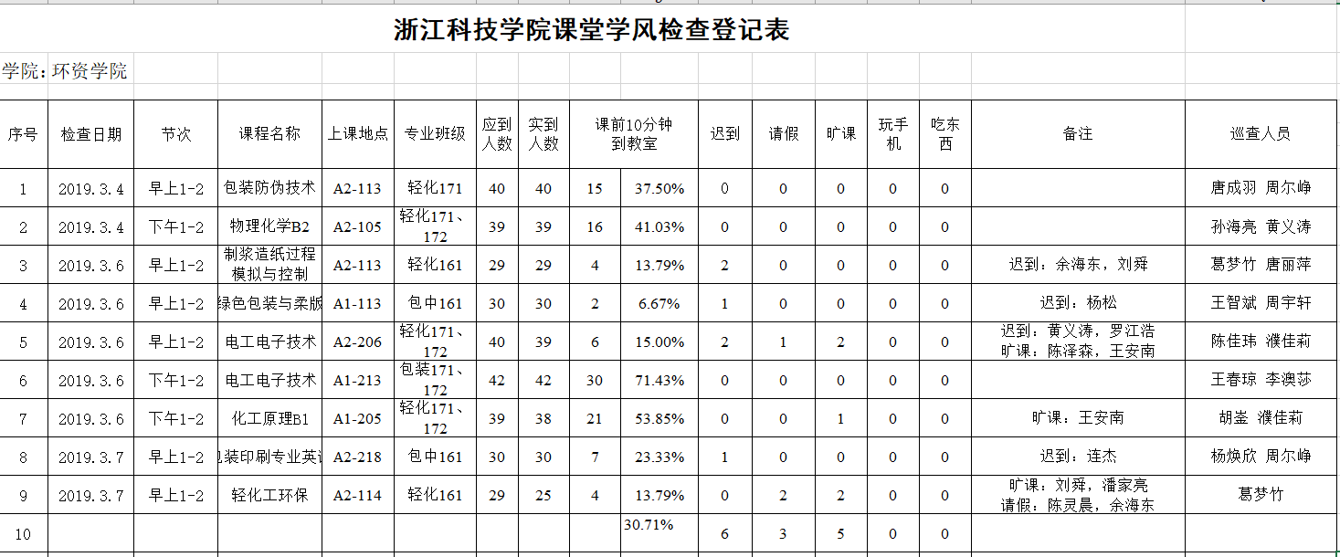 在本周的学风检查中,没有发现玩手机和吃零食现象,大部分同学能够提前到课堂,但仍有少数同学存在迟到和旷课现象。其中,轻化171、172班和轻化161班有旷课和迟到现象,包装中职161班有迟到现象,无旷课。总体来说,包装班的表现相对优良;下午提前十分钟到课率高于上午,但仍有待提高。