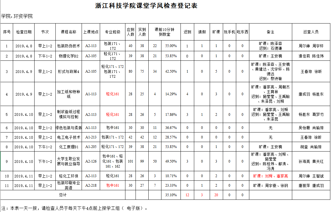 学风日常巡查统计只是发现问题的第一步,出于关心和帮助的行动的第二步才是至关重要。对于检查中存在的问题,还请班主任、任课老师、导师和班委共同监督和引导,帮助学业困难同学调整状态,做到持续改进,培育其优良的学风。