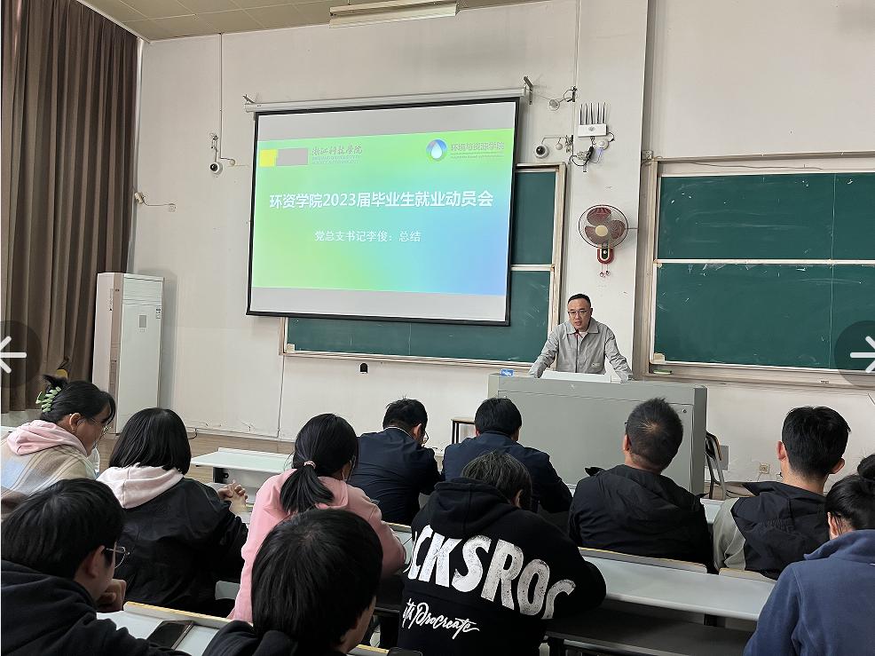 硕士招生的相关政策和要求,鼓励更多毕业生考取本校硕士研究生。再次,教务办主任赵红针对2023届毕业生技术实习,毕业设计环节等近期教务相关工作进行解读。最后,由学院党总支书记李俊作总结发言。李俊强调,当前的就业形势严峻,毕业生在思考什么是最适合自己的发展方向的同时,要志存高远,发挥自己的专业优势,为国家的社会经济发展贡献青春力量。